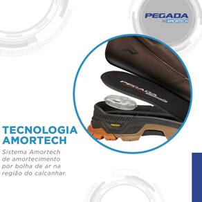 O fechamento em cadarço permite um ajuste firme e seguro, enquanto o puxador traseiro facilita o calce, oferecendo praticidade desde o primeiro uso. A palmilha anatômica em EVA se molda ao formato dos pés, proporcionando conforto prolongado, mesmo após horas de uso. Já o solado é tratado e emborrachado, com três vírgula cinco centímetros de altura e tecnologia Amortech com bolha de ar, responsável por amortecer os impactos na região do calcanhar e garantir estabilidade em diversos tipos de terreno.