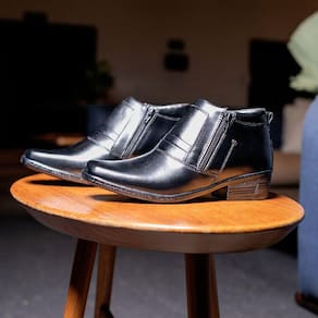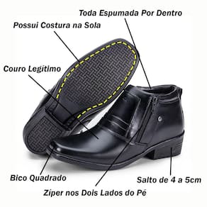 CABEDAL = Couro FECHAMENTO = Zíper nos Dois Lados do Pé SOLADO = Borracha (Possui Costura Na Sola) FORRAÇÃO = PVC com Espuma 5mm e Raspa de Couro no Calcanhar PALMILHA = PVC Acolchoada Almofadada ALTURA DO SALTO: Variação de cada número entre 4 a 5 cm. MEDIDAS DA CAIXA = 32X22X12 Centímetros