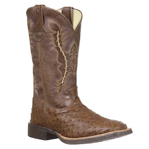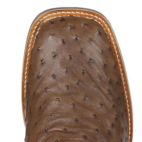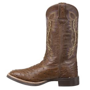 Bota Classic Masculina modelo Western, fabricada em couro Exótico de Avestruz na cor Marrom, possui cano longo bordado com reforço em couro macio na parte interna, forrada internamente, salto e solado de borracha antiderrapante.