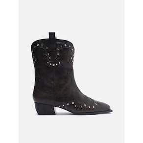Descrição: Bota feminina preta em couro desgastado. O modelo tem cano curto, salto baixo bloco em fachete e bico fino. Traz aplicações em couro e rebites metálicos no cabedal e cano. Não possui fechamento. Com tira como puxador na lateral do cano, facilitando o calce. Referência: A1276100170001