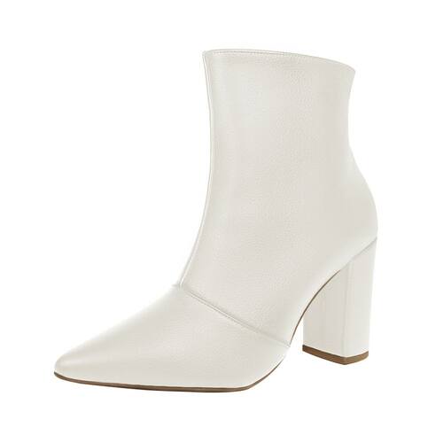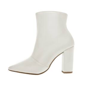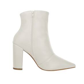 Linha de Bota Salto Alto Grosso Luiza Sobreira, cano curto, bico fino e zíper na lateral interna. Produzida em material sintético na cor Off White, com palmilha e forro em P.U., solado em TR.