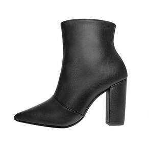 Linha de Bota Salto Alto Grosso Luiza Sobreira, cano curto, bico fino e zíper na lateral interna. Produzida em material sintético na cor Preta, com palmilha e forro em P.U., solado em TR.