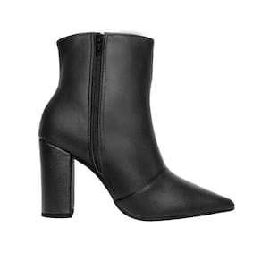 Linha de Bota Salto Alto Grosso Luiza Sobreira, cano curto, bico fino e zíper na lateral interna. Produzida em material sintético na cor Preta, com palmilha e forro em P.U., solado em TR.