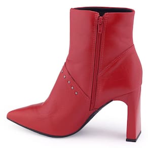Bota de salto alto Tanara T7723 Belmy Malagueta é um lindo modelo vermelho de salto geométrico e cano baixo que te acopanhará em diversos looks. É uma linda bota social de bico fino com o cabedal fabricado em couro e acabamento em recortes e costuras, tem como detalhe aplicação de tachas metalizadas quadradas no cabedal. Internamente é forrada proporcionando conforto, tem a palmilha fixa, macia e revestida. A bota traz um bom encaixe ao pé e o fechamento é por ziper na lateral interna. Seu bico é fino, reforçado com detalhe metal dourado em baixo, o salto alto geométrico possui acabamento em verniz brilhante e tem 9cm de altura, seu solado possui frisos para maior segurança.