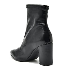 Marca: Via Marte Altura do salto: 9cm aproximadamente Altura do cano: 15cm aproximadamente Material externo: Stretch/Sintético/Verniz Material interno: Têxtil Material da palmilha: PU (Poliuretano) Material da sola: Emborrachado Acabamento: Colado/Costurado Ocasião de uso: Casual / Dia a Dia Modelo: 021-004-01 Referência: 02100401 Detalhes: Strech / Elastano / Salto Bloco.