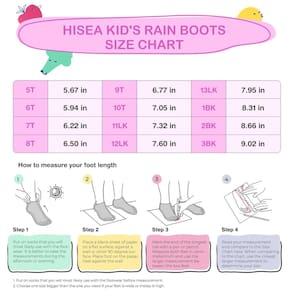 - BOTAS DE CHUVA PARA TODAS AS ESTAÇÕES — As botas de chuva infantis HISEA estão disponíveis em cores populares para meninos e meninas, garantindo uma combinação perfeita com sua personalidade e estilo. Ele pode ser utilizado em todas as estações e permite que as crianças explorem o ar livre com mais liberdade e liberem sua inocência infantil, protegendo-as totalmente em estações lamacentas e dias chuvosos.