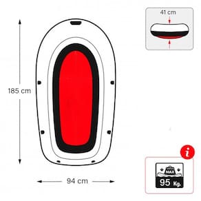 * Dimensões: Medindo aproximadamente 185 cm de comprimento, 94 cm de largura e 41 cm de altura quando totalmente inflado, oferece um espaço confortável para seus ocupantes.