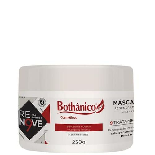 Máscara Capilar Regeneração Pós Química 250g – Bothânico A Máscara, rica em ingredientes ativos, promove intensa hidratação e regeneração, fortalecendo e restaurando a saúde comprometida da estrutura capilar, além de conferir maciez, brilho, força, cores vivas e reduzir o frizz. A Linha Renove Pós-Química para o cuidado especial na recuperação dos fios, proporcionando 9 benefícios: 1.Reconstrução Capilar 2. Limpeza Suave. 3. Proteção da Cor. 4. Brilho e Luminosidade. 5. Reposição de Massa. 6. Sistema Antioxidante. 7. Blindagem contra Danos. 8. Ação Antirressecamento. 9. Maciez e Sedosidade. A exclusiva tecnologia RESTORE INJET, os produtos proporcionam um complexo restaurador de proteínas, quinoa e cisteína bio-funcionalizada aos locais danificados da estrutura capilar, regenerando os fios e formando um escudo protetor inteligente. Modo de uso: Após lavar os cabelos, aplique uma quantidade generosa da Máscara em toda extensão dos fios, evitando a raiz. Massageie do comprimento às pontas, enluvando bem os fios. Deixe agir de 5 a 10 minutos. Enxágue bem. Use de 1 a 2 vezes por semana.