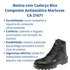 Adquira já sua Botina com Cadarço Bico Composite Antiestático Marluvas CA 21671 e garanta proteção, conforto e segurança em qualquer situação!
