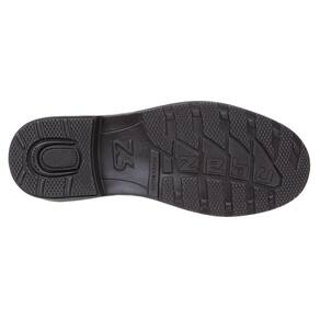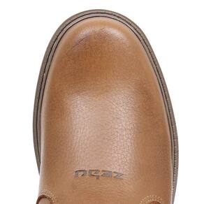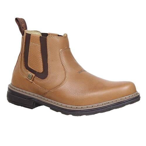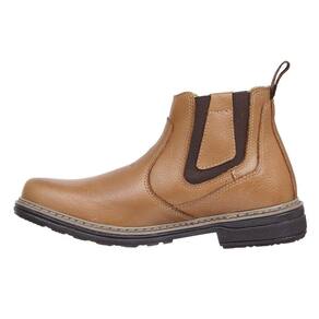 Botina masculina Zebu fabricada em couro na cor Caramelo, possui cano curto com elásticos laterais, bico redondo, vira costurada e solado de borracha