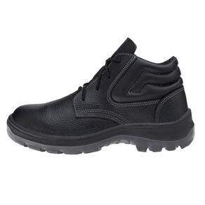 Botina de segurança confeccionada em vaqueta, com biqueira de PVC, almofada lateral, solado bidensidade em poliuretano (PU) injetado diretamente no cabedal.