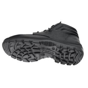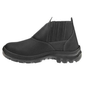 Botina de segurança confeccionada em vaqueta, com biqueira de PVC, almofada lateral, solado bidensidade em poliuretano (PU) injetado diretamente no cabedal.