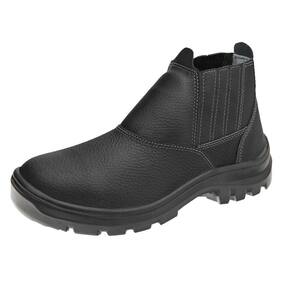 Botina de segurança confeccionada em vaqueta, com biqueira de PVC, almofada lateral, solado bi densidade em poliuretano (PU) injetado diretamente no cabedal.