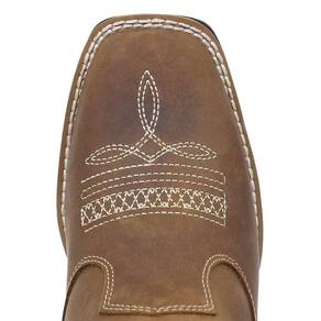 Botina feminina Zebu fabricada em couro na cor Marrom, possui cano curto com elásticos laterais, bico quadrado com florão costurado no peito do pé, vira costurada e solado de borracha.