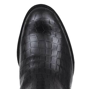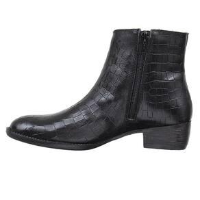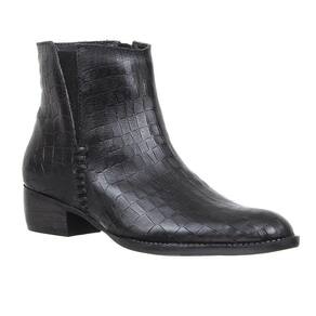 Botina feminina Cow Way fabricada em couro estilo jacaré na cor Preta, possui cano curto com elástico e zíper lateral, bico redondo e solado de borracha.