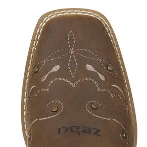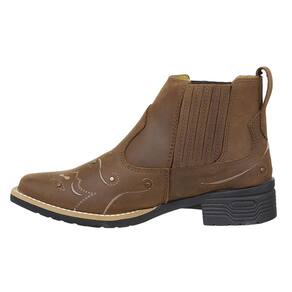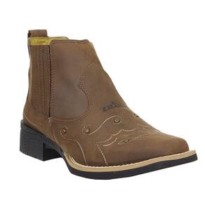 Uma Botina Feminina da marca Zebu, fabricada em couro de alta qualidade destacando a textura única do couro e detalhes rebitados, possui cano curto com elástico lateral acolchoado no interior, bico quadrado, vira costurada e solado de borracha tratorado.