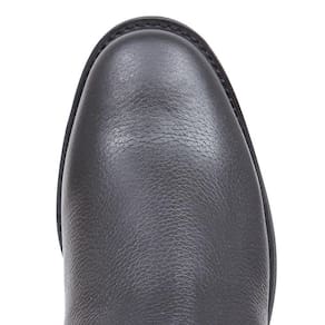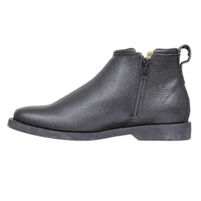 Botina masculina Zebu fabricada em couro na cor Preta, possui cano curto com zíperes laterais, bico redondo, vira costurada e solado de borracha.
