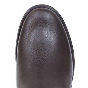 Botina masculina Zebu fabricada em couro na cor Café, possui cano curto com elásticos laterais, bico redondo, vira costurada e solado de borracha