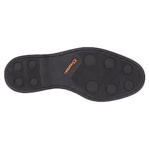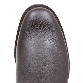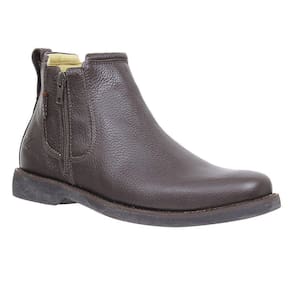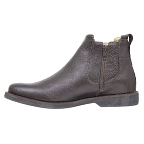 Botina masculina Zebu fabricada em couro na cor Café, possui cano curto com zíperes laterais, bico redondo, vira costurada e solado de borracha