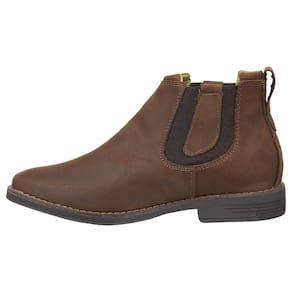 Uma Botina modelo Masculino da marca Zebu, fabricada em couro de alta qualidade destacando a textura única do couro, possui cano curto com elásticos laterais acolchoado no interior, bico redondo, vira costurada e solado de borracha tratorado.