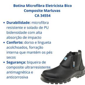 Botina Microfibra Eletricista Bico Composite Marluvas CA 34554 Botina de segurança confeccionada em microfibra na cor preta, com proteção elétrica e mecânica. Ideal para profissionais que atuam em áreas como construção civil, mecânica e manutenção industrial, oferece proteção contra choques em instalações elétricas de baixa tensão. Sem componentes metálicos, atende à NR 10. Possui fechamento em elástico, dorso acolchoado, abas laterais para calce, forração interna com tratamento antibacteriano, biqueira de composite leve e ultrarresistente, solado isolante em PU bidensidade, injetado diretamente no cabedal, e palmilha de montagem em poliéster resinado.