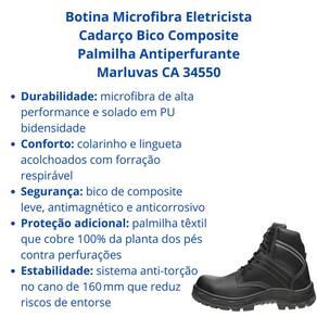Botina Microfibra Eletricista Cadarço Bico Composite Palmilha Antiperfurante Marluvas CA 34550  Proteção, Conforto e Durabilidade para Profissionais