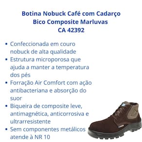 Botina Nobuck Café com Cadarço Bico Composite Marluvas CA 42392 Bota de segurança confeccionada em couro nobuck na cor café, ideal para ambientes administrativos, mecânicos, montadoras e prestadoras de serviços. Com estrutura fibrosa e microporosa, contribui para manter a temperatura interna dos pés. O calçado oferece conforto e proteção com colarinho e lingueta semifole soft acolchoados, fechamento em cadarço marrom e biqueira de composite leve e ultrarresistente. Possui solado isolante em PU bidensidade, injetado diretamente no cabedal, além de forração interna Air Comfort com tratamento antibacteriano.