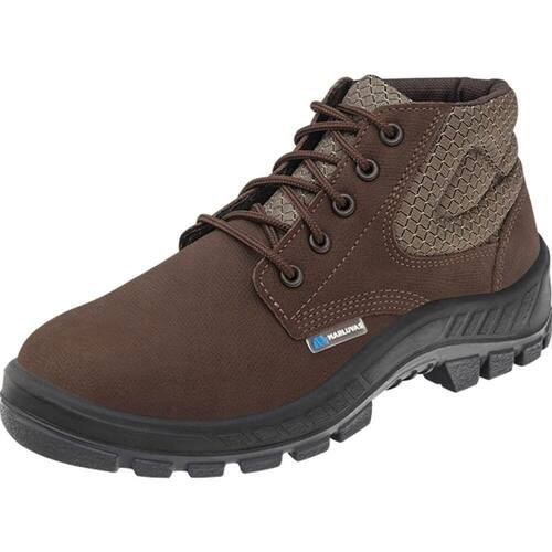 - Calçado ocupacional tipo botina, fechamento em cadarço, confeccionado em couro nobuck na cor café, cano acolchoado em tecido, forro da gáspea em não tecido, forro lateral em tecido, sem peças metálicas, palmilha de montagem em não tecido resinado fixada pelo sistema strobel, palmilha interna em EVA com tecido, biqueira de polipropileno para conformação, solado de poliuretano bidensidade injetado diretamente no cabedal, resistente à absorção de energia no salto e à passagem de corrente elétrica.