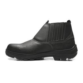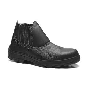 Características Adicionais: Botina de proteção com elástico lateral, com dorso acolchoado, confeccionado em couro estampa relax. Forração interna da gáspea em não tecido e forro do cano em tecido com alto poder de absoção. Biqueira plástica conformada, palmilha de não tecido e sobre-palmilha de eva. Solado em poliuretano (pu) bidensidade, constituído por duas camadas, injetado diretamente ao cabedal. Calçado que proporciona conforto.