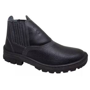 Botina confeccionada em couro, fechamento em elástico, com biqueira de aço, solado monodensidade injetado direto ao cabedal e blaqueado.