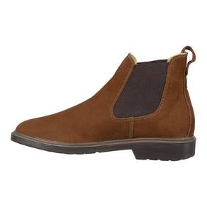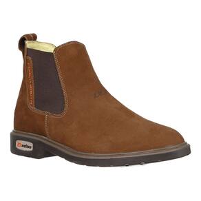 Uma Botina modelo Unissex da marca Zebu, esta fabricada em couro na cor Castor, possui cano curto com elásticos laterais, bico redondo, vira colada e solado de borracha detalhado.