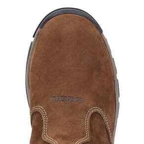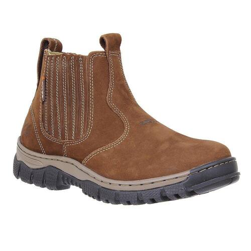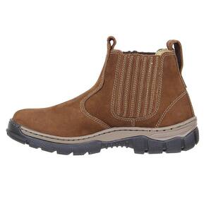 Botina unissex Zebu fabricada em couro na cor Marrom, possui cano curto com elásticos laterais, bico redondo, vira costurada e solado de borracha
