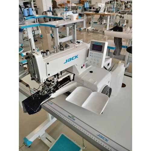 JK-1377EB BOTONEIRA DIRECT-DRIVE JACK Maquina de costura tipo pregadeira de botão direta drive, ponto corrente, sistema para aplicar botões 2 e 4 furos e "X", diâmetro do botão de 10 a 28MM, altura do levantamento de calcador até 9MM, velocidade de 1.500RPM, caixa de comando e painel acoplados diretamente ao cabeçote da maquina, com corte de linha, com mesa e estante com rodinhas. Versão 220V. A MONTAGEM É FEITA POR CONTA DO COMPRADOR !
