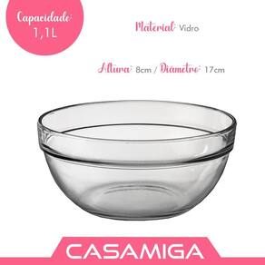 - Altura: 8cm - Diâmetro: 17cm - Capacidade: 1100ml - Material: Vidro - Não pode ir ao Micro-ondas. - Marca: Rigolleau - Cor: Transparente - Conteúdo: 1 Bowl