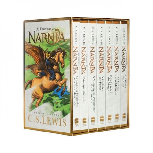 AS EDIÇÕES DEFINITIVAS DE NÁRNIA EM UM BOX EXCLUSIVO Guarda-roupas mágicos, anéis que levam para outros mundos, cavalos falantes e, o mais impressionante, um leão muito poderoso! As Crônicas de Nárnia são a aclamada série de livros, escritos por C. S. Lewis, que narram as aventuras de crianças corajosas no nosso mundo e em outros universos mágicos e desconhecidos. Ao adquirir o box As Crônicas de Nárnia – Coleção de Luxo você garante a saga completa, em edição de luxo, na sua estante. São sete livros capa dura, com pintura trilateral, páginas amareladas, fitilho e detalhes dourados. As edições contam ainda com a nova tradução do professor Ronald Kyrmse – que também é um tolkienista de respeito – e com as ilustrações coloridas de Pauline Baynes. Tudo isso em um box rígido colorido, com soft-touch e detalhes em dourado. Este box inclui os seguintes livros: · O Sobrinho do Mago – Coleção de Luxo · O Leão, a Feiticeira e o Guarda-Roupa – Coleção de Luxo · O Cavalo e seu Menino – Coleção de Luxo · Príncipe Caspian – Coleção de Luxo · A Viagem do Peregrino da Alvorada – Coleção de Luxo · A Cadeira de Prata – Coleção de Luxo · A Última Batalha – Coleção de Luxo
