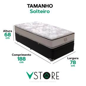 A tecnologia que a sua casa merece está na V-Store! O Conjunto Colchão Four Seasons e Base Box Baú Bravus é a solução ideal para quem busca conforto, durabilidade e praticidade. O colchão, com molas ensacadas, pillow top e tecnologia EPS, oferece suporte independente e conforto térmico, enquanto o revestimento em malha 100% algodão e tratamentos antiácaro e antialérgico garantem mais saúde e bem-estar. A Base Box Baú Bravus, feita com madeira reflorestada e revestida com tecido sintético, combina resistência, elegância e funcionalidade, oferecendo um excelente espaço de armazenamento e otimizando o seu quarto.Característica Do Colchão: Modelo: Four SeasonMarca: V-StoreTamanho: SolteiroDimensões: 78x30x188 (Largura x Altura x Comprimento)Conforto: MédioSistema: Molas EnsacadasPillow: Pillow TopPeso Máximo recomendado: 150 kg (Por pessoa)Proteções: Antiácaro, antialérgico, antifungo, antimofoGarantia: 12 Meses (Espuma) / 10 anos ( Conjunto de Molas Ensacadas)Característica Da Base: Marca: V-StoreModelo: BravusCor do Box: PretoTamanho: SolteiroDimensões: 78x44x188 (Largura x Altura x Comprimento)Estrutura: MadeiraPeso máximo recomendado: 150 kg (Por Pessoa)Altura do Box: 38 cmAltura dos Pés: 6 cmAltura total: 44 cmGarantia: 12 Meses (Estrutura) / 3 meses (Tecido)Selo Ecologicamente CorretoAtenção:- Antes de finalizar sua compra, recomendamos que verifique se as dimensões do produto são adequadas para serem transportadas pelos elevadores, portas, escadas e corredores de sua residência. Ressaltamos que não nos responsabilizamos pelo transporte do produto por meios específicos, como escadas, guinchos ou içamentos.- É possível que hajam leves variações de cor de acordo com o dispositivo que está sendo utilizado como smartphones, computadores, monitores e outros.