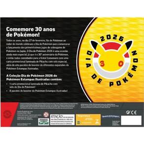 A coleção Dia de Pokémon 2026 do Pokémon Estampas Ilustradas contém:• 1 carta promocional laminada de Pikachu com selo do Dia de Pokémon! • 8 pacotes de booster do Pokémon Estampas Ilustradas!