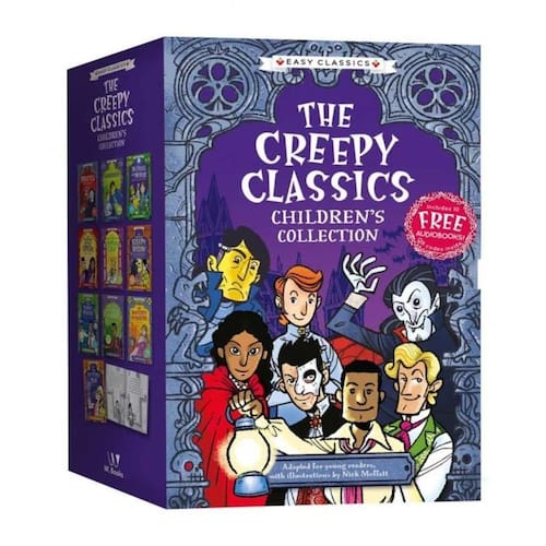 The creepy classics children's collection: The invisible man, The mysteries of Udolpho, The fall of the house of Usher, The ghosts pirates, The picture of Dorian Gray, The phanton of the opera, The legend of Sleepy Hollow, Dr. Jeckyll and Mr. Hyde, Frankenstein and Dracula.