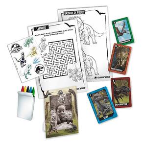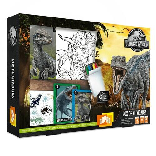 Com mini jogos, o box inclui lâminas com atividades variadas, uma caixa de giz, uma cartela de adesivos, pôster e um porta -retrato de Jurassic World