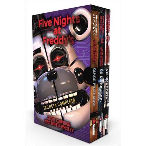 Com mais de 70 mil exemplares vendidos no Brasil, chega às lojas o box da trilogia Five Nights at Freddy s, série de livros do game mais aterrorizante dos últimos tempos O game Five Nights at Freddy s conquistou legiões de fãs no mundo todo, e a série de livros seguiu a mesma trilha de sucesso. Escritos por Scott Cawthon, criador do jogo, e Kira Breed-Wrisley, os três livros que compõem o box Olhos prateados, Os distorcidos e A última porta são a combinação perfeita de terror, ação e mistério, trazendo à tona os medos mais obscuros que só brinquedos sinistros são capazes de provocar. A pizzaria Freddy Fazbear s era o ponto de encontro da cidadezinha de Hurricane. O lugar ficou famoso pelos enormes animatrônicos que pareciam ter vida própria e divertiam os clientes. Mas a brincadeira se tornou um pesadelo quando o estabelecimento virou palco de terríveis assassinatos. Dez anos depois, Charlie, a filha do dono da pizzaria, retorna à cidade e reencontra os amigos do passado.