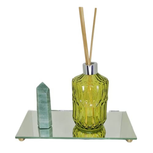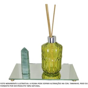 O Box do Equilíbrio é composto por 1 Ponta de Quartzo Verde, 1 Frasco de Vidro Difusor com Varetas e 1 Bandeja de Espelho.