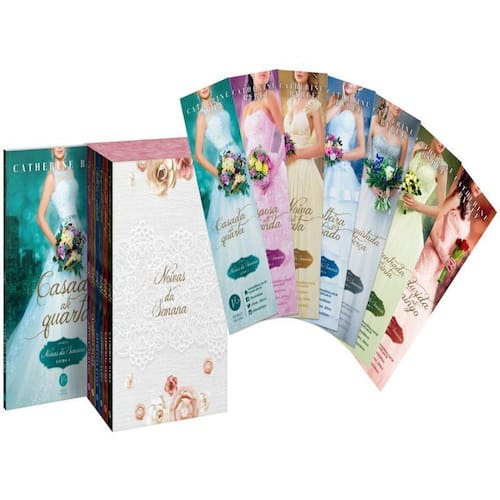 " Os sete deliciosos romances de Catherine Bybee agora juntos em uma linda caixa acompanhada dos marcadores de todos os livros da série! As edições econômica, impressas em papel branco e sem orelha, foram feitas exclusivamente para o box! As histórias de tirar o fôlego de Catherine Bybee que conquistaram milhares de fãs pelo mundo, agora estão reunidas pela primeira vez. Venha se envolver com a paixão, o suspense e a sensualidade da série Noivas da semana, contendo um românce para cada dia da semana! O box inclui os sete livros da série - Casada até quarta, Esposa até segunda, Noiva até sexta, Solteira até sábado, Conquistada até terça, Seduzida até domingo e Encontrada até quinta - e marcadores temáticos. Casada até quarta (196 pág.) Blake Harrison é um homem rico, nobre, charmoso... e precisando de uma esposa até quarta-feira. Para isso, Blake recorre a Samantha Elliot, linda e exuberante, com a voz mais sexy que ele já ouviu. Dona da agência de casamentos Alliance, ela não está no menu de pretendentes... até Blake lhe oferecer milhões de dólares por um contrato de um ano. Agora, ela precisa disfarçar a atração que sente por seu novo marido e evitar a todo custo a cama dele. Mas os beijos ardentes de Blake e seu charme inegável se provam muito difíceis de resistir. Era um contrato de casamento que previa tudo... menos se apaixonar. Agora só resta a Samantha proteger seu coração até que o contrato chegue ao fim. Esposa até segunda (252 pág.) Carter Billings, com seus cabelos loiros, olhos azuis e beleza hollywoodiana, pode ter a mulher que quiser. Mas, quando decide concorrer à vaga de governador do estado da Califórnia, Carter sabe que vai precisar abandonar a vida de solteiro. E para isso ele precisa de uma esposa. Entra Eliza Havens, que gerencia a agência de casamentos Alliance. Eliza nunca brigou tanto com um homem - e nunca conheceu alguém que mexesse tanto com ela. Juntar pessoas solitárias é a maneira como ela ganha a vida, porém um obscuro segredo do passado a faz descartar totalmente a possibilidade de se casar. Pelo menos foi assim até agora... Noiva até sexta (308 pág.) Gwen Harrison é a bela filha de um duque inglês que se mudou para os Estados Unidos para cuidar da agência de casamentos de sua cunhada. Só porque ela agora é a chefe da agência, não significa que não possa fantasiar um encontro perfeito com o enigmático Neil MacBain, o guarda-costas que vem tornando seus sonhos um tanto quanto agitados. O ex-fuzileiro naval Neil MacBain não pode negar o efeito da aristocrata Gwen em seu corpo esculpido pela rotina militar. Mas negócios são negócios, e manter distância é fundamental - até uma ameaça do passado de Neil retornar e Gwen se ver no meio do fogo cruzado. Agora depende de Neil decidir o que é mais importante salvar: sua carreira, sua vida... ou a mulher que conquistou seu coração. Solteira até sábado (280 pág.) Karen Jones se casou com um astro de Hollywood, porém é ela quem desempenha diariamente um papel - o de esposa feliz. Um ano atrás, ela concordou em se casar um ator famoso para dissipar rumores sobre a vida pessoal dele. Agora seu divórcio se aproxima, assim como um pagamento de cinco milhões de dólares. No entanto, conforme Karen se prepara para abandonar com elegância seu casamento arranjado, ela conhece o cunhado, Zach Garnder, um homem lindo de morrer. E quando o casal famoso decide visitar a família Gardner, Karen precisa esconder o segredo do marido e de seus parentes bisbilhoteiros... incluindo Zach, o homem que talvez seja o verdadeiro amor da vida dela. Conquistada até terça (290 pág.) Judy Gardner acabou de se formar na faculdade e está pronta para ganhar o mundo... desde que consiga um emprego. Enquando não se torna a profissional respeitada que espera ser, ela se muda para a casa de seu irmão celebridade em Los Angeles. Mas é difícil para Judy se concentrar no trabalho quando o guarda-costas sexy por quem ela se apaixonou no verão passado continua aparecendo em sua vida e tirando seu fôlego. Com um corpo musculoso, olhos verdes e sorriso fácil, Rick Evans poderia ter a mulher que ele quisesse. Mas ele só tem olhos para a impulsiva Judy. Quando ela sofre um ataque, Rick sabe que não vai parar até ter certeza de que a mulher da sua vida está a salvo do monstro atrás dela. Seduzida até domingo (294 pág.) Meg Rosenthal, administradora de agência de casamentos e realista nas horas vagas, não é mulher de se deixar seduzir por um empresário bonitão em um terno feito sob medida. Mas há algo no fascinante italiano Valentino Masini que é difícil de resistir, mesmo para uma mulher que se recusa a se apaixonar. O lindo e bem-sucedido homem de negócios está acostumado a ter as melhores coisas da vida. No entanto, ele nunca quis nada como quer Meg, a mulher que está criando uma tormenta em seu coração. Quando ele finalmente decide convencê-la a ficar, uma pessoa m