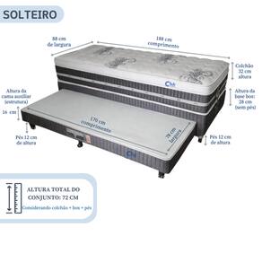 MEDIDAS E SUPORTE Colchão superior: 88 x 188 x 32 cm Suporte: até 130 kg Estrutura da base: Suporte: até 150 kg por pessoa Cama auxiliar: Suporte: até 90 kg