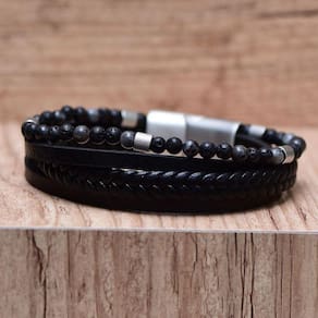 Bracelete aço 21cm 2 couro trabalhado 1 trançado e shambala vulcanica/labradorita intercalado steel trabalhado