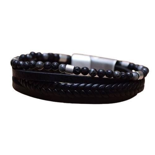 Bracelete aço 21cm 2 couro trabalhado 1 trançado e shambala vulcanica/labradorita intercalado steel trabalhado