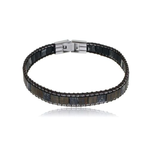 Bracelete aço 21cm gomos quadrados amadeirados com madreperola bordas trabalhado couro marrom detalhe e fecho steel.