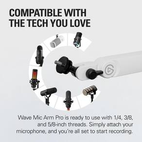 - Perfil baixo: Wave Mic Arm Pro White possui tecnologia de suspensão superior para ajustes ultra-suaves e silenciosos; é compatível com uma ampla variedade de marcas e modelos de microfone: Sennheiser, Audio-Technica, HyperX, Rode, Shure, Neumann e muito mais
