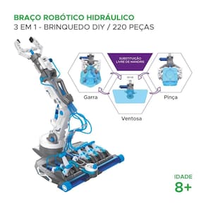 - Nome do produto: Braço Robótico Hidráulico 3 em 1 - Funcionalidade: pinça, garra e ventosa - Quantidade de peças: 220 peças - Idade recomendada: a partir de 8 anos - Fonte de energia: hidráulica não requer baterias ou motor - Montagem: requer montagem manual, com instruções inclusas no kit - Propósito educacional: desenvolve habilidades de lógica, criatividade e aprendizado sobre hidráulica Marca: Não Informado