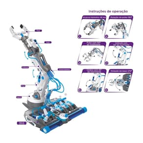 Com três modos de funcionamento - garra, pinça e ventosa -, o Braço Robótico Hidráulico é versátil, permitindo diferentes configurações para diversas tarefas simuladas. Um produto seguro, indicado para crianças a partir de 8 anos, testado conforme padrões internacionais.