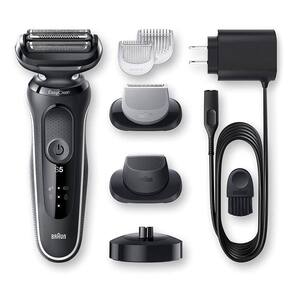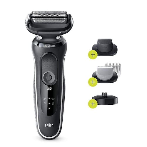 Braun barbeador elétrico masculino com aparador de barba de precisão, aparador de corpo, recarregável, úmido e seco com suporte de carregamento EasyClean e preto, conjunto de 6 peças.Sobre este aparelhoMáquina de barbear elétrica fácil de limpar para homem com 3 lâminas flexíveis que se adaptam aos contornos faciais para um barbear renteO sistema EasyClean oferece limpeza rápida e fácil sem remover a cabeça de corteBateria de íon de lítio para até 3 semanas de barbear (50 min). Carregamento rápido de 5 minutos para um barbear completoBarbeador elétrico 100% à prova d'água para uso úmido e secoInclui: suporte de carregamento, acessório de aparador de precisão, acessório de modelagem do corpoGrande Natal, aniversário e presente de aniversário para ele. Presente perfeito para marido, namorado, pai e todos os homens em sua vida.Mais informações do produtoSistema EasyClean.Limpe sua navalha sem remover a cabeça da navalha. A água flui através dos elementos de corte e limpa o restolho.Ele fecha sem esforço e faz a barba facilmente.O novo barbeador elétrico da Série 5 se adapta aos contornos faciais com suas 3 lâminas flexíveis.Atualizar com EasyClickAtualize sua navalha para mais necessidades de cuidados pessoais. Inclui um acessório de aparador de precisão e um acessório de corpo da antepara.Fácil de lidar.O novo cabo ergonômico permite um barbear sem esforço com um movimento simples e unilateral.Bateria de íon de lítio de longa duração.1 carga completa fornece até 3 semanas de barbear.5 minutos de carregamento rápido são suficientes para um barbear completo.100% à prova d'água para uso úmido e seco.Concebido para se barbear a seco, com espuma, gel e no duche.Feito na Alemanha.Nossos produtos são feitos para durar.